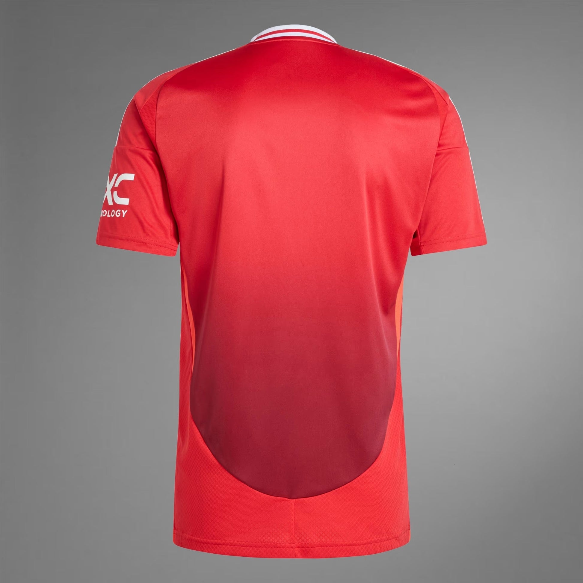 Manchester United at Old Trafford. Home fans adore them and even rivals can't ignore them. In 24/25, the club's timeless home jerseys shout even louder with bright red inserts on the sides and a subtle gradient design on the front and back. Made for supporters, this adidas soccer shirt includes moisture-managing AEROREADY and an embroidered badge.This product is made with 100% recycled materials. By reusing materials that have already been created, we help to reduce waste and our reliance on finite resources and reduce the footprint of the products we make.