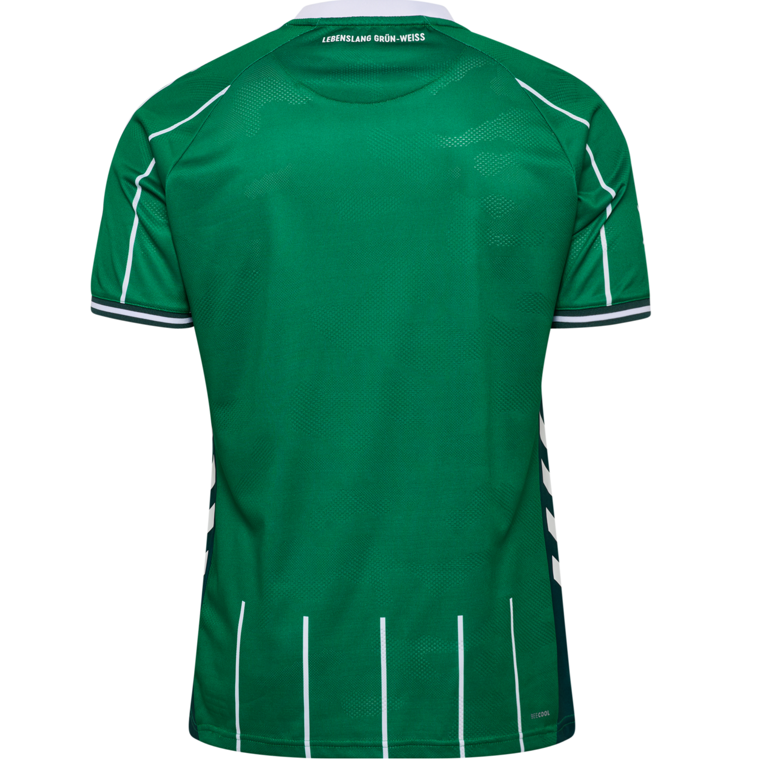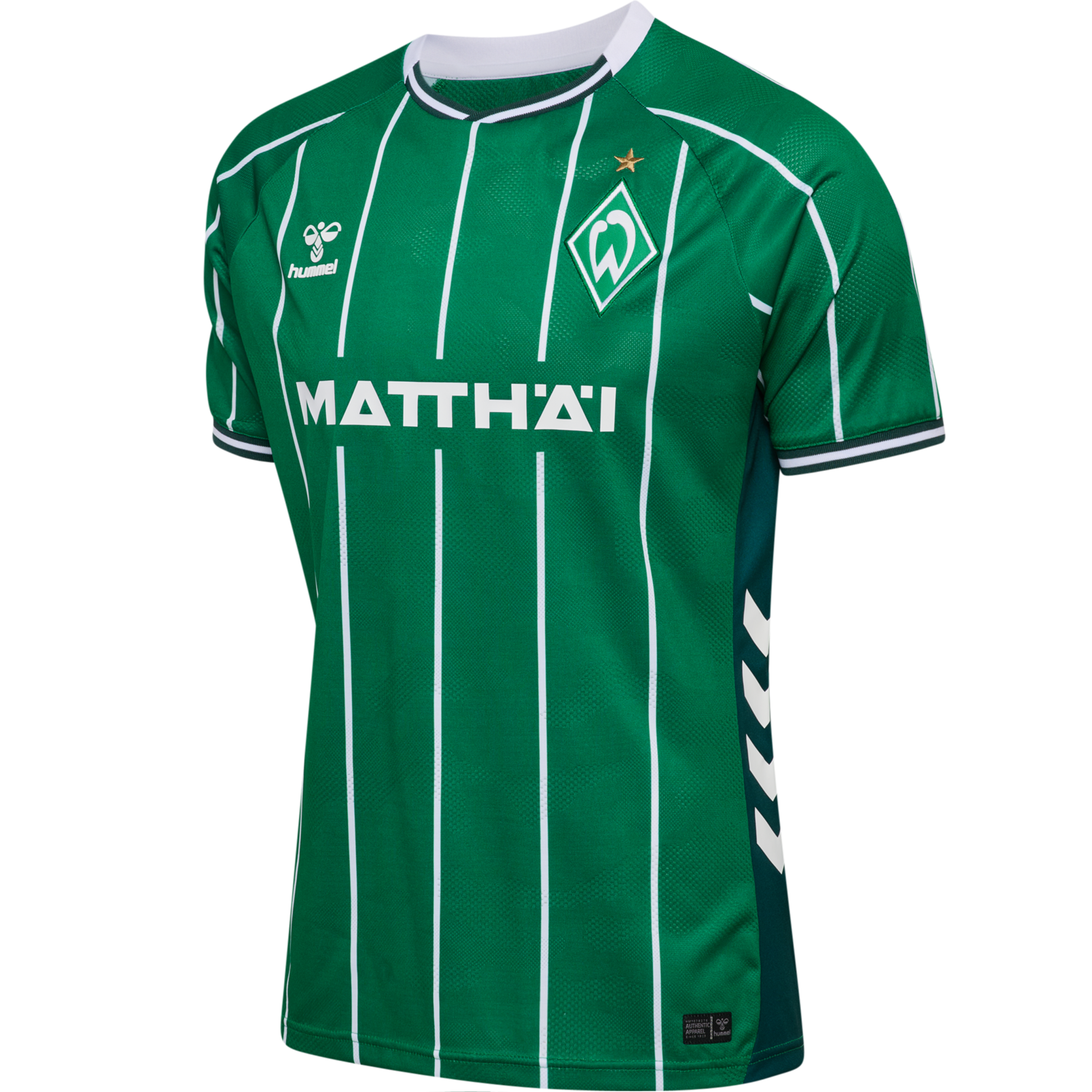 The Werder Bremen Home Jersey 25/26 comes in the club’s classic green with white details. The front, back, and sleeves feature white pinstripes, while the side panels are made in a darker green tone. The jersey includes a round neck with contrast stripe and sleeve cuffs with matching contrast. Made from 100% recycled polyester with Beecool technology for breathability and comfort. Club identity is highlighted with the “LEBENS LANG GRÜN – WEISS” neck print, hummel logo and club badge on the chest, and signature hummel chevrons on the side panels.